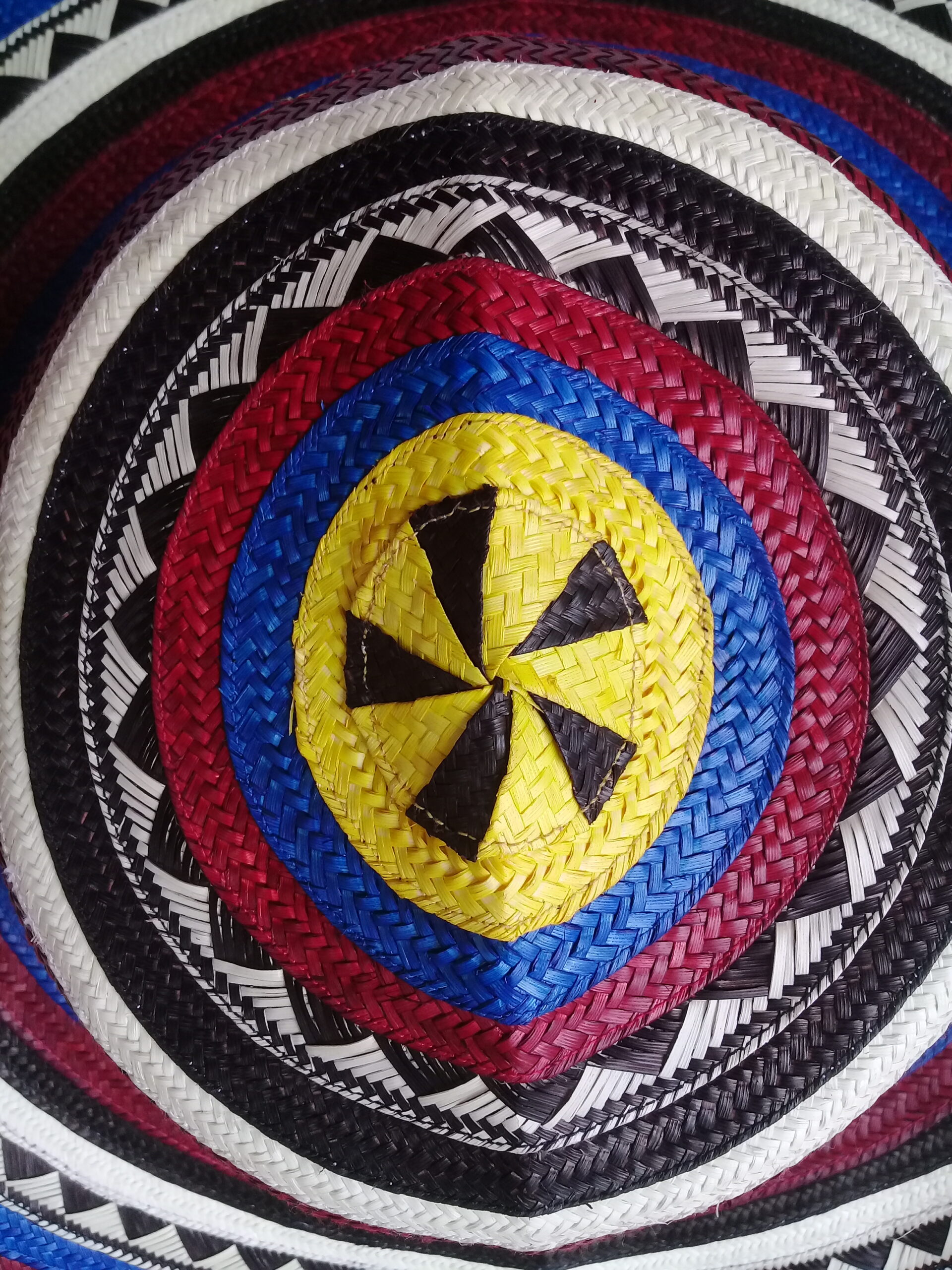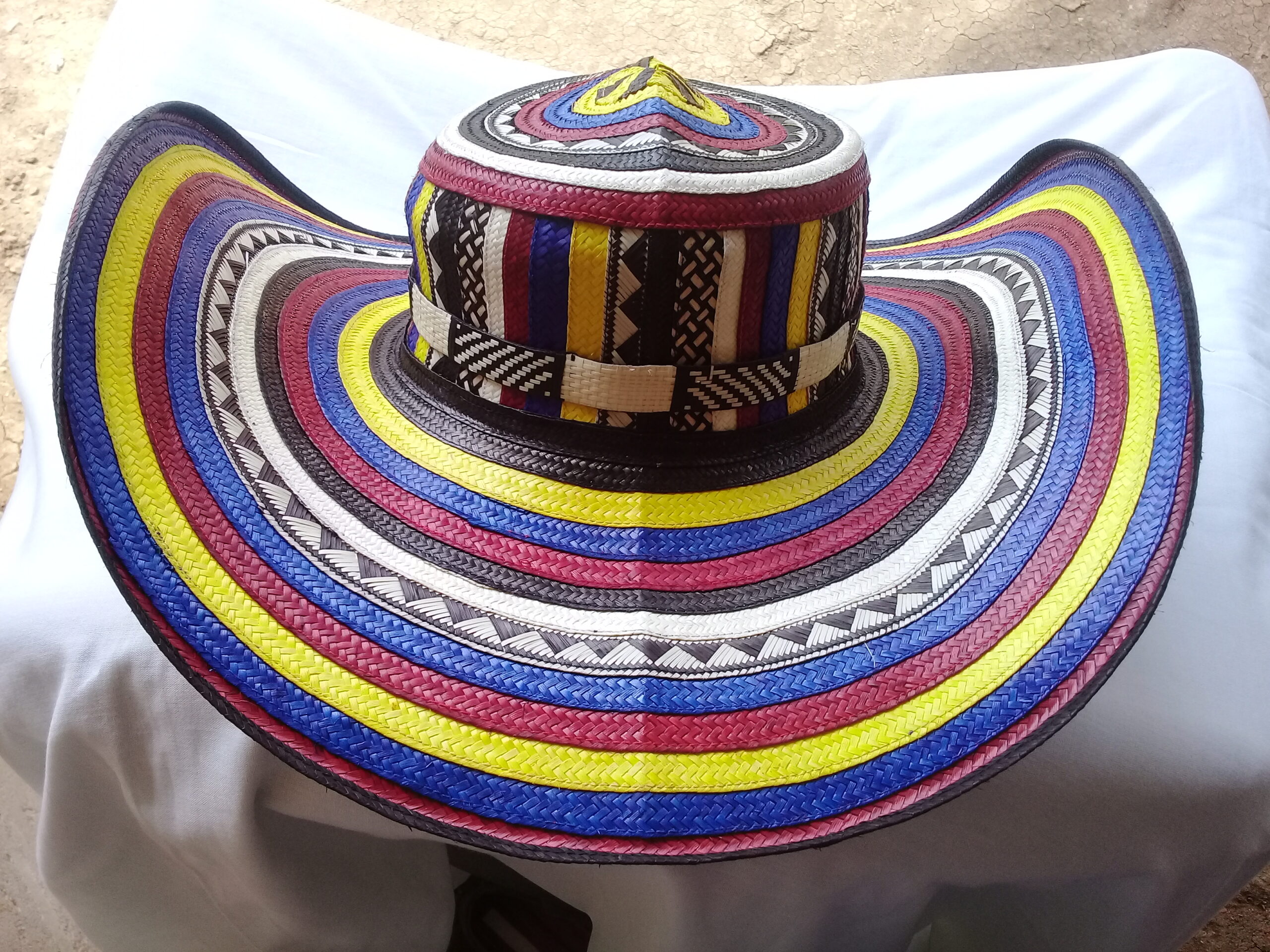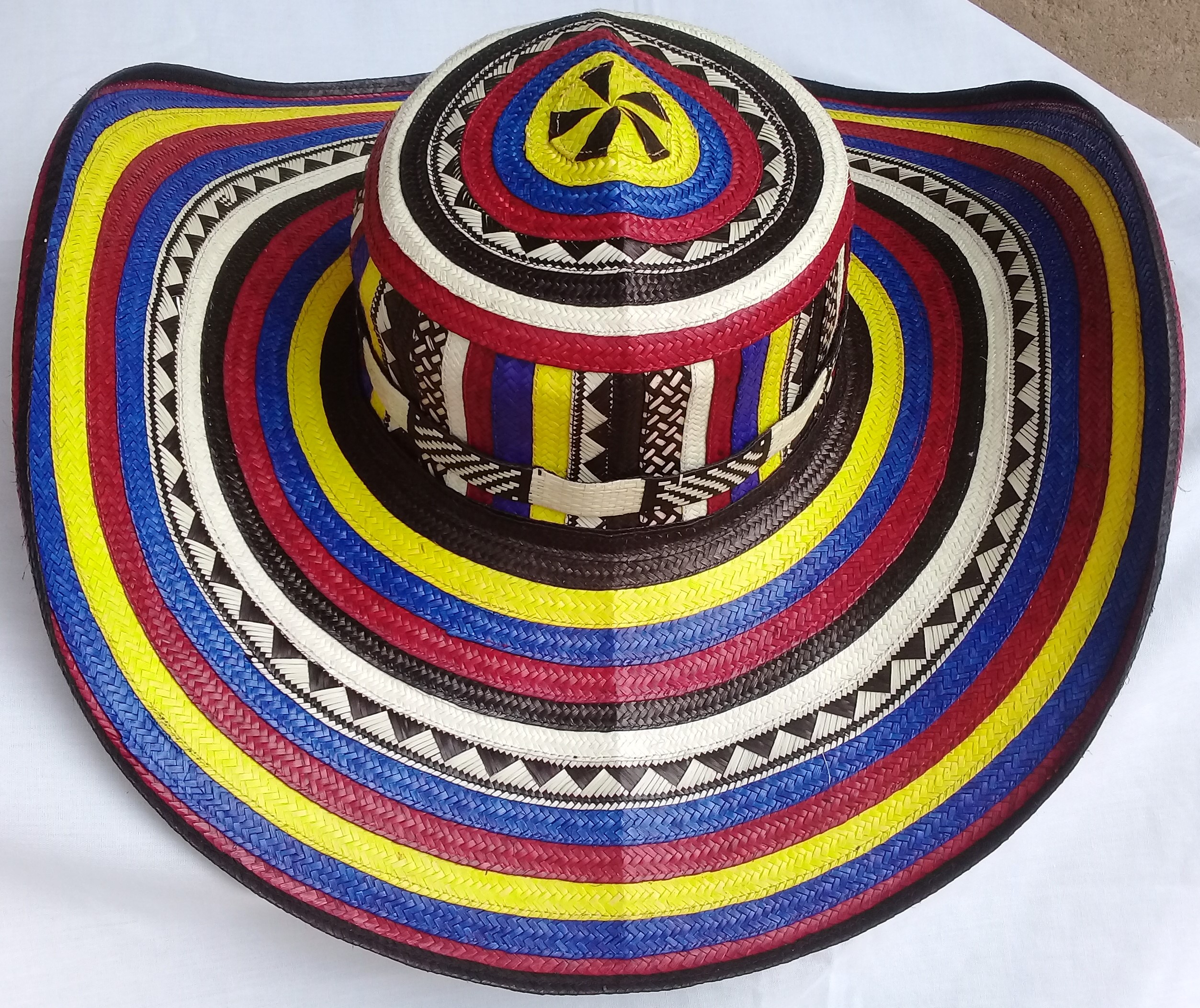 Sombrero 11 vueltas: con los colores de la bandera colombiana, tejido con 11 pares de fibra cada vuelta o cinta que conforma el sombrero,